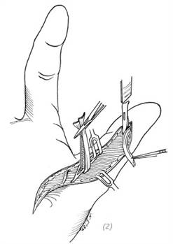 (1), (2) если сухожилия глубоких и поверхностных сгибателей повреждены в ладонной части и дефектов сухожилий немного, то проксимальные или дистальные сухожилия поверхностных сгибателей можно использовать в качестве трансплантационных для восстановления сухожилий глубоких сгибателей. Натяжение шва на сухожилии должно осуществляться при нахождении пальца в среднем физиологическом положении