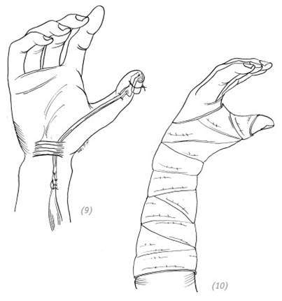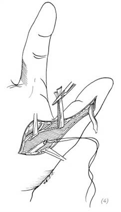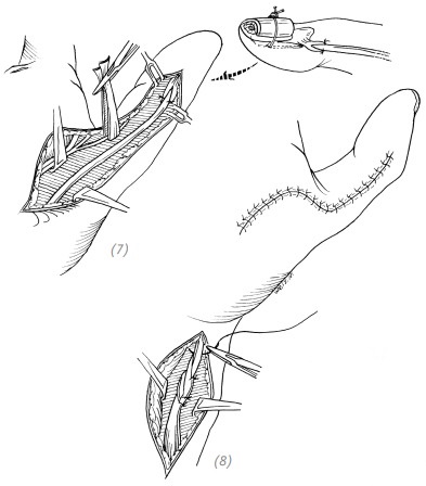 (6) через разрезы на тыльной стороне пястно-фалангового сустава и на дистальном конце предплечья находят дистальную и проксимальную культю разорванного сухожилия