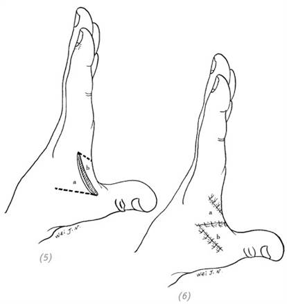 (5) рана, идущая параллельно кожной складке, между первым и вторым пальцами кисти (6) во избежание контрактуры в области межпальцевой кожной складки выполнена Z-образная пластика (встречными треугольными лоскутами)
