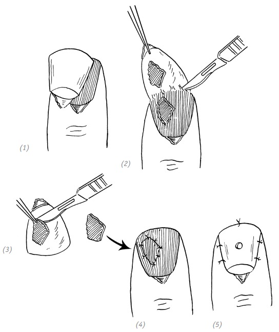 (1) рана центральной части ногтевого ложа; (2) V-образная резекция мягких тканей, ампутация проксимальных и дистальных костных концов фаланги; (3) убивание ногтевого ложа, ногтевой пластинки и кожи