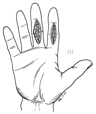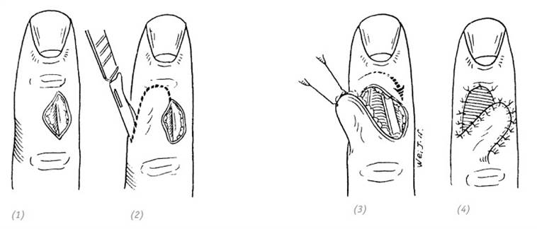 (2), (3) во время хирургической обработки придаём ране ромбовидную форму. Разрезы проходят от верхнего конца раны до латеральных концов поперечной кожной складки пальца или боковых сторон пальца и встречаются у нижнего конца раны