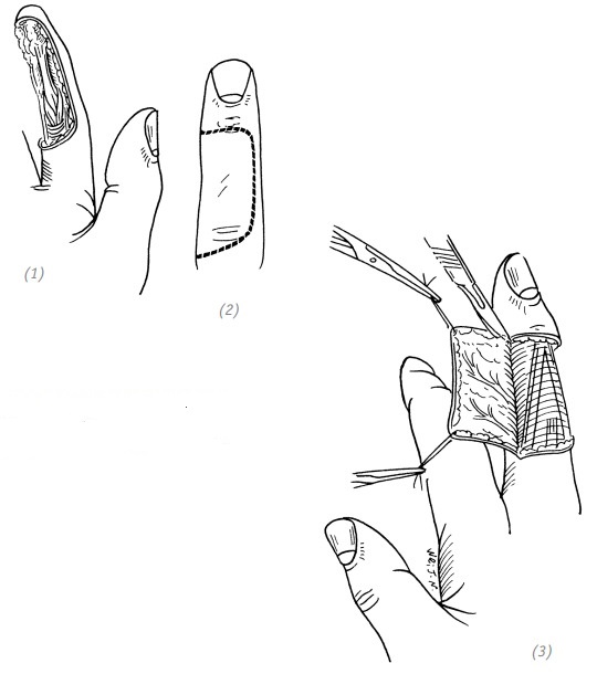 (2), (3) кожный лоскут выкраивается на неповреждённом участке средней и дистальной фаланги указательного пальца