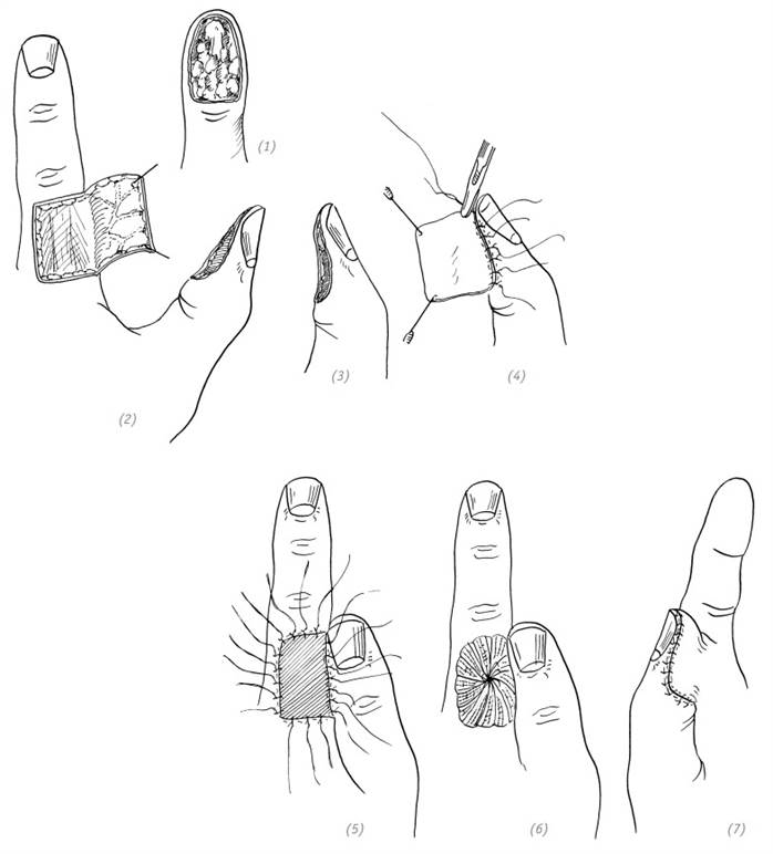 (5)лоскут подкожной клетчатки поместить на реципиентную зону и подшить. Откинутый ранее кожный лоскут на соседнем пальце уложить на место и подшить, оставляя длинные концы лигатур; (6) сверх лоскута подкожной клетчатки подшить расщеплённый кожный лоскут, оставляя длинные концы лигатур; (7) на оба кожных лоскута положить давящие марлевые салфетки и свободно забинтовать