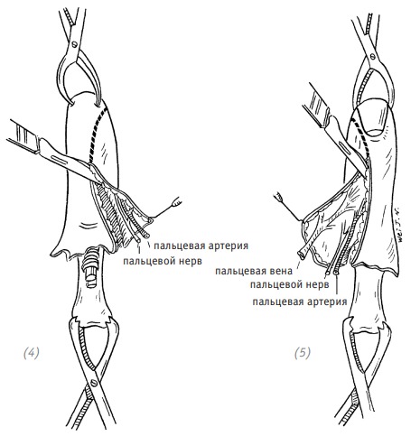 (4), (5) вырезаем свободный кожный лоскут вместе с пальцевыми артерией, веной и нервом
