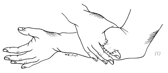 (1)поперечный дефект кончика указательного пальца и дефекты подушечек среднего и безымянного пальцев; (2), (3) восстановление дефекта кончика указательного пальца тенарным лоскутом. Восстановление дефекта кожи подушечки среднего пальца лоскутом с тыльной поверхности указательного пальца. Восстановление дефекта кожи подушечки безымянногопальца лоскутом с тыльной поверхности среднего пальца; (4) внешний вид пальцев после пересечения питательных ножек