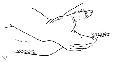 (4)подшивание края свободного кожного лоскута к реципиентной зоне;(5), (6) укладываем свободный кожный лоскут на донорскую зону и накладываем швы, оставляя длинные концы лигатур. Подшиваем кожный лоскут с соседнего пальца к реципиентной зоне. На донорскую зону накладываем давящую повязку