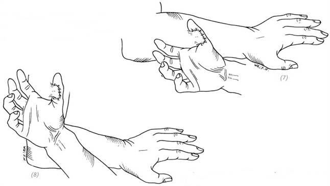 (7) восстановление дефекта ладонной поверхности большого пальца, лоскут на наружной стороне предплечья (8) восстановление дефекта ладонной поверхности большого пальца, лоскут на наружной стороне плеча