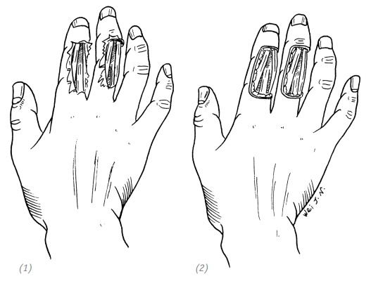 При кожной пластике относительно больших дефектов ладонной поверхности пальца необходимо соблюдать те же правила, что и при пластике дефектов кончика пальца. Ввиду того, что дефект относительно большой, выкраиваемый лоскут также будет большим. Во время пересадки обычно не возникает проблем с кровообращением в кожном лоскуте, но возникают повышенные требования к восстановлению донорской зоны на соседнем пальце. Если в послеоперационном периоде возникнет нагноение или некроз кожного лоскута донорской зоны, это может сказаться на функции пальца – вызвать серьёзные нарушения функции пальца. Поэтому во время выкраивания кожного лоскута на соседнем пальце необходимо оставить нетронутыми мягкие ткани, окружающие сухожилие тыльного разгибателя пальца. На донорскую зону пересадить средней толщины расщеплённый кожный лоскут. Наложить давящую повязку и зафиксировать кисть гипсовой шиной (рис. 3–2).