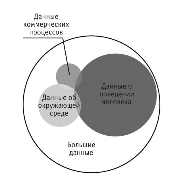 Примечание: взаимное влияние разных типов данных. Коммерческие данные могут естественным образом содержать в себе и производить данные о поведении человека и окружающей природной среде, точно так же данные о поведении человека и окружающей природной среде являются взаимовключающимися, перекрёстными и взаимовлияющими. В прошлом мы фиксировали что-либо, только предварительно выбрав, что именно должно быть зафиксировано. В эпоху больших данных мы выбираем то, что зафиксировано быть не должно, и затем удаляем запись об этом. По мере непрерывного расширения сферы фиксирования можно быть уверенным: в будущем совокупный объём данных, имеющихся в распоряжении человека, будет нарастать подобно снежному кому.