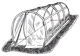 Укрытие шатрового типа. Каркас изготавливают из брусков сечением 3×3 см и длиной 1–1,2 м и конькового бруса. Бруски соединяют при помощи гвоздя или болта и заглубляются в землю на 20–25 см. Такие козелки устанавливают через 2–3 м и на них укрепляют коньковый брус. Пленку укладывают на козелки, а внизу прикапывают. Вентилируют сооружение, поднимая пленку вдоль укрытия и на торцах.