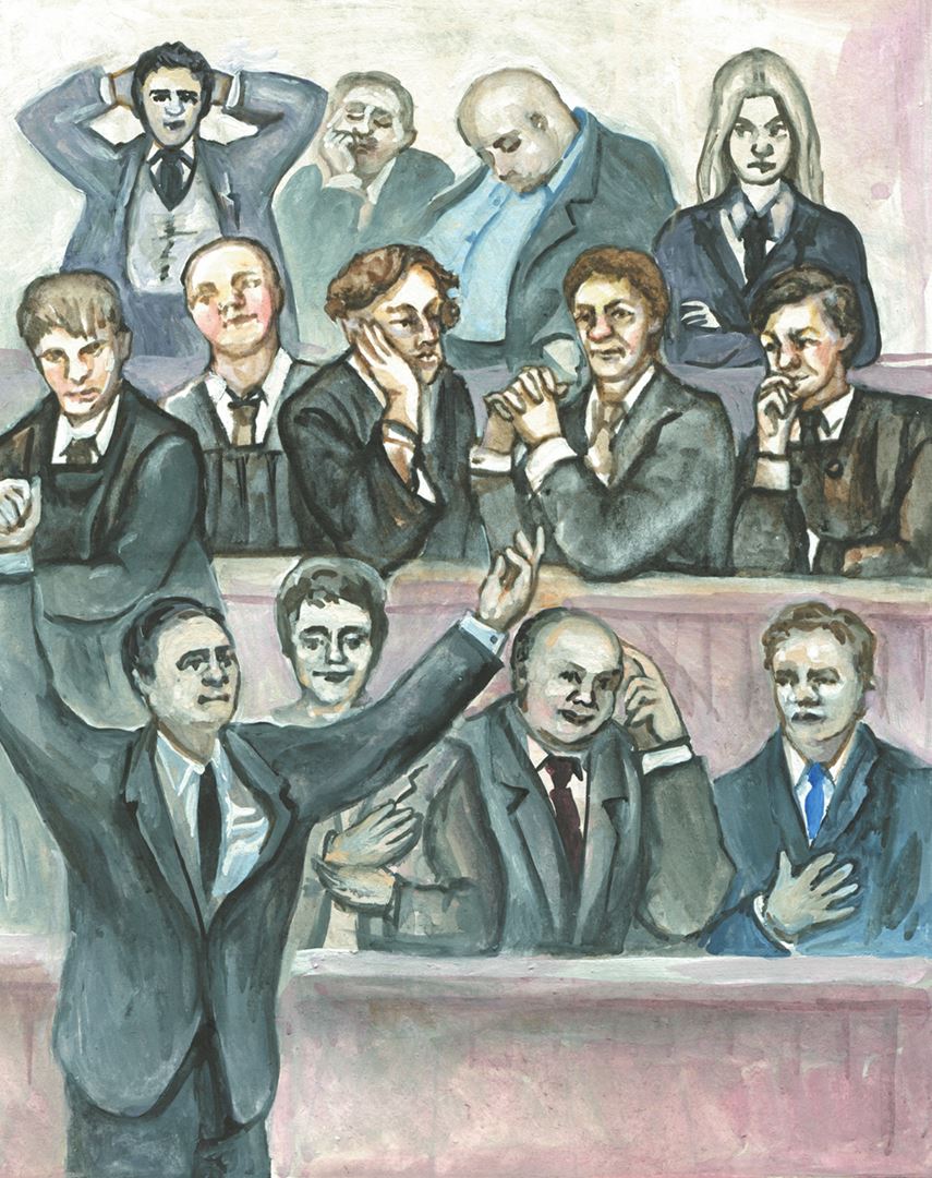 Например, если судья сидит глубоко в кресле с опущенным подбородком и скрещенными на груди руками, то внимательный адвокат заметит, что его речь не имеет успеха, с его доводами не согласны. Типичная поза критической оценки – подпирание судьей щеки указательным пальцем, в то время как другой палец прикрывает рот, а большой палец поддерживает подбородок. Отрицательное отношение, негативные чувства судьи можно увидеть по жесту сцепленных пальцев рук. Когда судья подставляет руку, чтобы опереть на нее голову, то это верный признак того, что ему стало скучно. Если судья не повернул к адвокату ни головы, ни корпуса тела, но смотрит искоса, а голова наклонена вперед, брови слегка изогнуты, а руки крепко скрещены на груди, то это означает неодобрение. И, напротив, если судья наклонил голову набок, то это говорит о том, что он заинтересован. Адвокат, в свою очередь, может повысить кредит доверия судьи, выработав привычку в процессе общения держать ладони открытыми вверх.