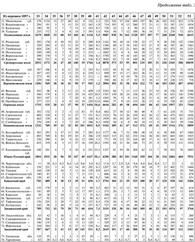 В столбце 43 содержится счет 5,1 млн лиц, зарабатывающих на промышленности переделывающей, т. е. ремесленной и фабричнозаводской. В переписи в этом отношении сделано очень много различий: выплавка металлов, обработка волокнистых веществ, животных продуктов, дерева, металлов, изделий из глины и стекла, химических продуктов, разных напитков, табака, производство печатных изделий, разных инструментов (физических, оптических и т. п.), ювелирных изделий, одежды, стройки, экипажей и т. п., но, не желая усложнять своих таблиц, я все отдельные числа свел в один столбец 43, тем более что и при таком скоплении разнообразных отраслей производства и ремесел получилась сравнительно небольшая общая сумма. Она пропорционально велика только в Подмосковном промышленном районе, где более 9,6 % жителей работают в указанном направлении. Сравнительно крупна и в Петербургском, Пермском и Польском краях, но во всех остальных промышленников относительно очень мало, что и отвечает общему слабому развитию у нас переделывающей промышленности.