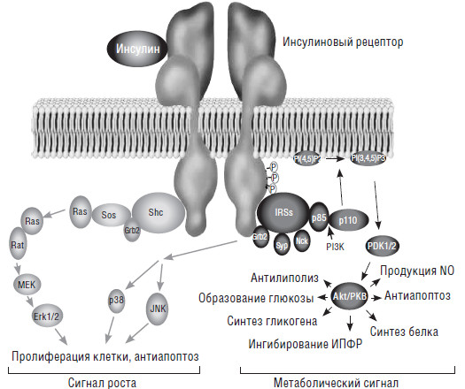 Как и другие гормоны, свое действие инсулин осуществляет через белок-рецептор. Инсулиновый рецептор представляет собой сложный белок клеточной мембраны, состоящий из двух субъединиц, каждая из которых образована двумя полипептидными цепочками. Связывание инсулина с внеклеточной областью инсулинового рецептора вызывает конформационные изменения, приводящие к автофосфорилированию рецептора и тирозинсвязанных внутриклеточных белковых молекул. Имеются два основных каскада. Один из сигнальных путей (слева), ведущий к каскадной активации Grb2/Sos, приводящей к пролиферации клетки и замедлению апоптоза. Из-за их митогенного эффекта это действие инсулина может быть охарактеризовано, как эффект «фактора роста». Второй путь (справа), активация киназ (р85/р110) так называемым «путем протеинкиназы В». Этот путь условно называется метаболическим
