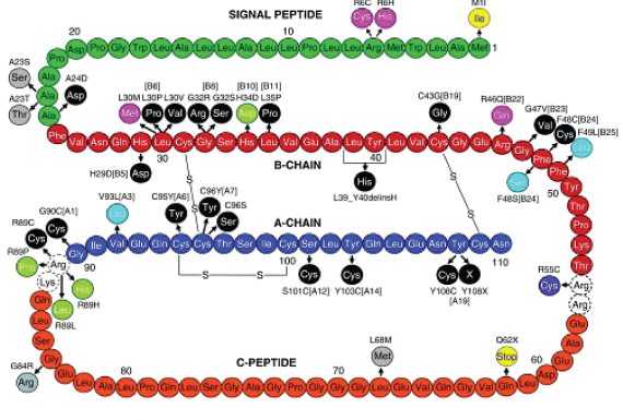 Схематическое изображение аминокислотной последовательности человеческого препроинсулина (сигнальный пептид – зеленый, В-цепь – красная, С-пептид – оранжевый, А цепь – темносиняя) с указанием участков мутации, идентифицированных у больных с сахарным диабетом, а также с гиперинсулинизмом и гиперпроинсулинизмом. Черным цветом обозначены мутации, вызывающие нарушения дисульфидных связей в молекуле проинсулина, приводящих к возникновению перманентного сахарного диабета новорожденных (см. 3 главу); светло-голубым – мутации, приводящие к нарушениям связи инсулина с рецептором; светло-зеленым – мутации, приводящие к нарушению секреции инсулина. Мутации, обозначенные розовым и фиолетовым цветами, встречаются при диабете 1-го типа. Мутации, обозначенные серым цветом, встречаются редко и протекают без функциональных нарушений в биосинтезе проинсулина/инсулина. Желтым цветом, обозначены мутации, являющиеся рецессивными, затрагивающие биосинтез инсулина (инициации трансляции)