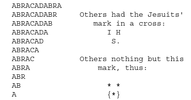 But there was still another madness beyond all this, which may serve to give an idea of the distracted humour of the poor people at that time: and this was their following a worse sort of deceivers than any of these; for these petty thieves only deluded them to pick their pockets and get their money, in which their wickedness, whatever it was, lay chiefly on the side of the deceivers, not upon the deceived. But in this part I am going to mention, it lay chiefly in the people deceived, or equally in both; and this was in wearing charms, philtres, exorcisms, amulets, and I know not what preparations, to fortify the body with them against the plague; as if the plague was not the hand of God, but a kind of possession of an evil spirit, and that it was to be kept off with crossings, signs of the zodiac, papers tied up with so many knots, and certain words or figures written on them, as particularly the word Abracadabra, formed in triangle or pyramid, thus: —