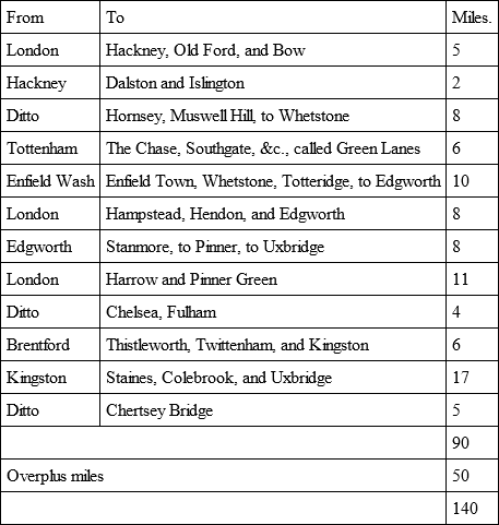 As thus: suppose the tax on land and tenements for the whole county of Middlesex does, or should be so ordered as it might, amount to £20,000 per annum more or less, which it now does, and much more, including the work of the farmers’ teams, which must be accounted as money, and is equivalent to it, with some allowance to be rated for the city of London, &c., who do enjoy the benefit, and make the most use of the said roads, both for carrying of goods and bringing provisions to the city, and therefore in reason ought to contribute towards the highways (for it is a most unequal thing that the road from Highgate to Smithfield Market, by which the whole city is, in a manner, supplied with live cattle, and the road by those cattle horribly spoiled, should lie all upon that one parish of Islington to repair); wherefore I will suppose a rate for the highways to be gathered through the city of London of £10,000 per annum more, which may be appointed to be paid by carriers, drovers, and all such as keep teams, horses, or coaches, and the like, or many ways, as is most equal and reasonable; the waste lands in the said county, which by the consent of the parishes, lords of the manors, and proprietors shall be allowed to the undertakers, when inclosed and let out, may (the land in Middlesex generally letting high) amount to £5,000 per annum more. If, then, an Act of Parliament be procured to settle the tax of £30,000 per annum for eight years, most of which will be levied in workmen and not in money, and the waste lands for ever, I dare be bold to offer that the highways for the whole county of Middlesex should be put into the following form, and the £5,000 per annum land be bound to remain as a security to maintain them so, and the county be never burdened with any further tax for the repair of the highways.