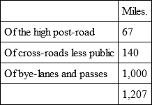 But of the last sort, not to be accounted by particulars, in the small county of Middlesex we cannot allow less in cross-bye-lanes, from village to village, and from dwelling-houses which stand out of the way to the roads, than 1,000 miles.