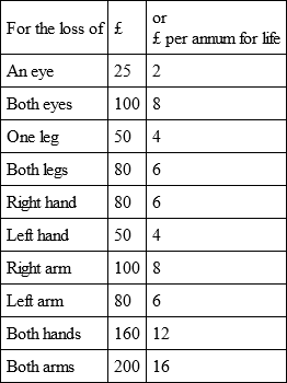 If a seaman who enters himself, or is pressed into, the king’s service be by any accident wounded or disabled, to recompense him for the loss, he receives a pension during life, which the sailors call “smart-money,” and is proportioned to their hurt, as for the loss of an eye, arm, leg, or finger, and the like: and as it is a very honourable thing, so it is but reasonable that a poor man who loses his limbs (which are his estate) in the service of the Government, and is thereby disabled from his labour to get his bread, should be provided for, and not suffer to beg or starve for want of those limbs he lost in the service of his country.