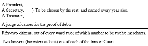 A Court of InquiriesThis court should consist of a select number of persons, to be chosen yearly out of the several wards of the City by the Lord Mayor and Court of Aldermen, and out of the several Inns of Court by the Lord Chancellor, or Lord Keeper, for the time being, and to consist of,