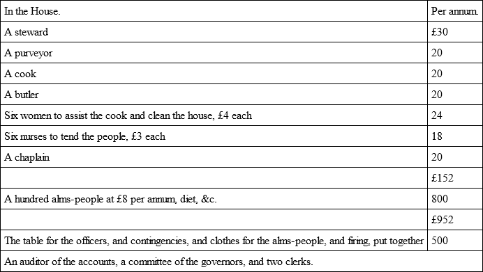 Here I suppose £1,500 per annum revenue, to be settled upon the house, which, it is very probable might be raised from the tax aforesaid. But since an Act of Parliament is necessary to be had for the collecting this duty, and that taxes for keeping of fools would be difficultly obtained, while they are so much wanted for wise men, I would propose to raise the money by voluntary charity, which would be a work that would leave more honour to the undertakers than feasts and great shows, which our public bodies too much diminish their stocks with.