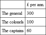 The general to be named by the founder, out of the colonels; the colonels to be named by the general, out of the captains; the captains out of the governors; the governors from the directors; and the directors from the exempts; and so on.