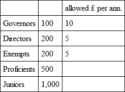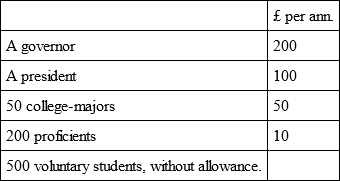 Every teacher shall continue at least one year, but by allowance two years at most; shall have £20 per annum extraordinary allowance; shall be bound to give their constant attendance; and shall have always five college-majors of the second college to supervise them, who shall command a month, and then be succeeded by five others, and, so on – £10 per annum extraordinary to be paid them for their attendance.