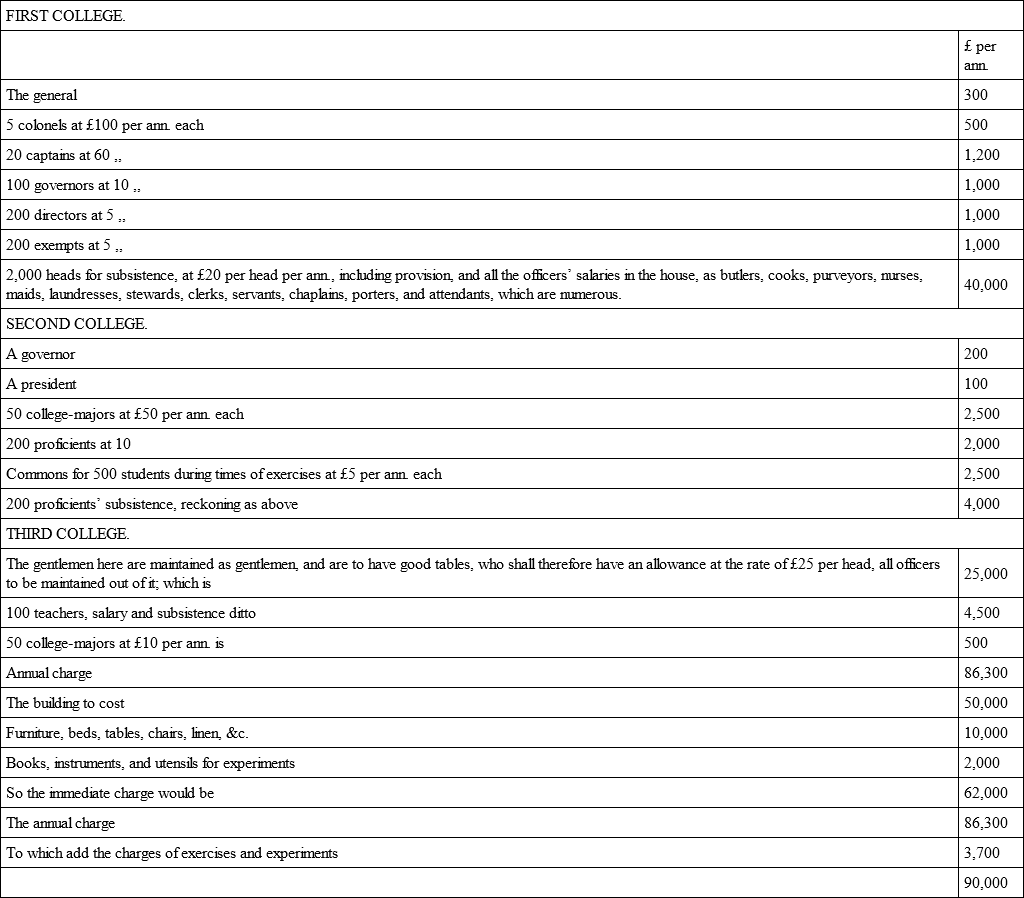 The third – being for gentlemen to learn the necessary arts and exercises to qualify them for the service of their country, and entertaining them one whole year at the public charge – may be supposed to have always one thousand persons on its hands, and cannot have less than 100 teachers, whom I would thus order: