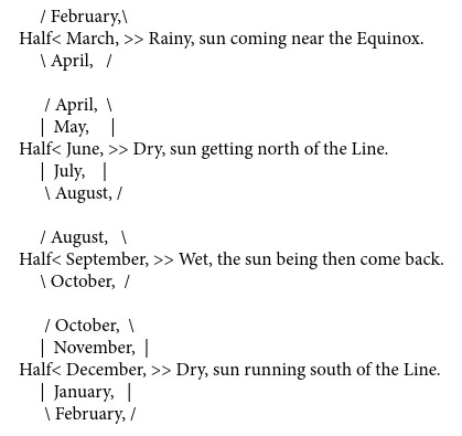And now I perceived that the seasons of the year might generally be divided, not into summer and winter, as in Europe, but into wet and dry seasons, as in this manner: