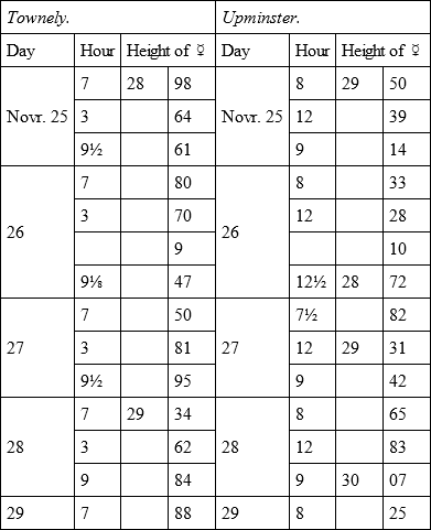 As to November 17th (whereon Mr. Towneley mentions a violent Storm in Oxfordshire) it was a Stormy Afternoon here at Upminster, accompanied with Rain, but not violent, nor ☿ very low. November 11th and 12th had both higher Winds and more Rain; and the ☿ was those Days lower than even in the last Storm of November 26th.