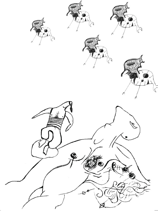 Ведь есть люди, которые носят по-настоящему огромные меховые шапки, думаю я выходя за дверь. Дверь-то дверь, но где же ключ? И зачем я вообще вышел за дверь. Вернуться обратно, подмести полы, покричать в перьевые подушки и раскрашивать фаянс простым карандашом. Или лучше по-простецки бить мух. Вот одна и, предположим, она розовая, розовощёкая муха в треуголке, на длинных стеклянных ногах. У неё густые брови и высокий воротник, и зычный голос, и правильное произношение. Она – ослепительная моя подруга.