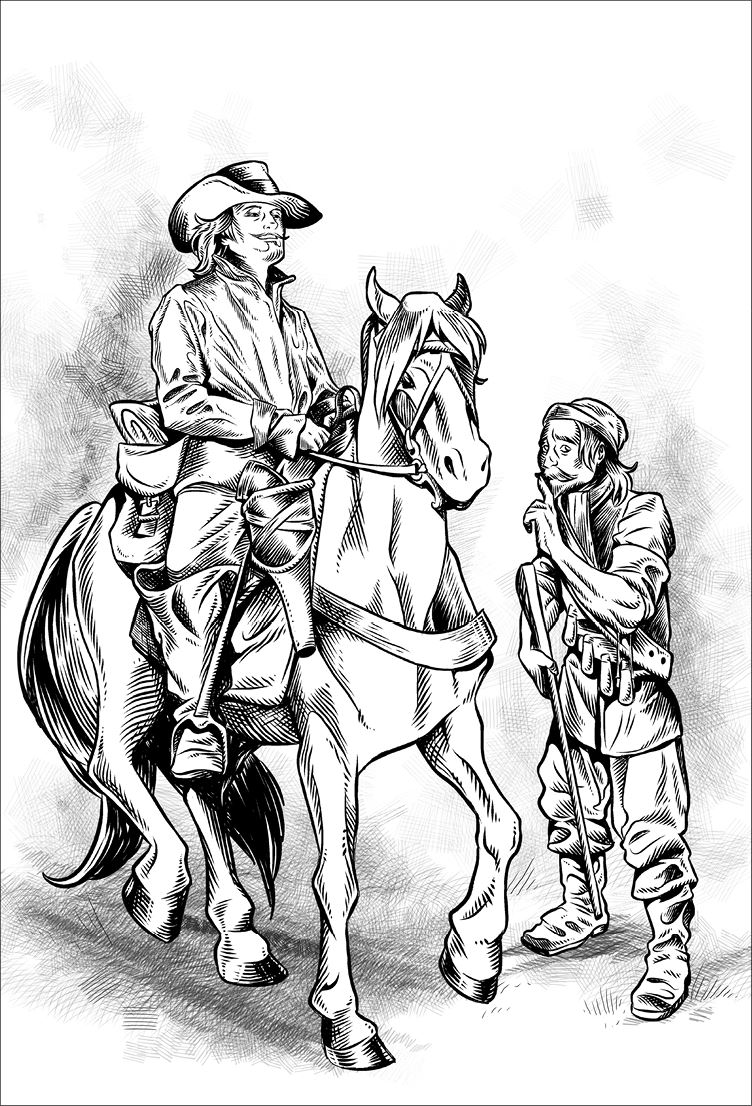 Сообразительный Бонифаций тотчас водрузил мушкет на плечо, надвинул шляпу по самые брови, а свободной рукой ухватился за стремя.