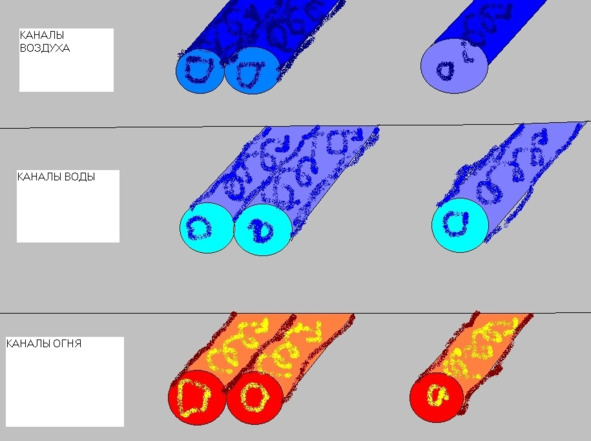 Энергия в них движется по спирали по часовой стрелке. Поэтому когда вы осваиваете тот или иной канал, двигайтесь именно в этом направлении. При постижении энергии, всегда пользуйтесь одно или двуствольными каналами. Сколькоствольными каналами вам нужно воспользоваться, это вам придёт самим. Эти же каналы кроме воды и огня есть ещё и у воздуха.