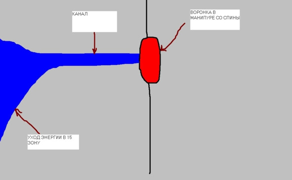 На рис. 12 Это то, что увидел Целитель Света, один из Владык Белого Братства. В области задней части Манипуры есть чёрная воронка, и по энергетическому каналу твоя биоэнергия уходит в 15-ю зону, которая не отработана тобой.
