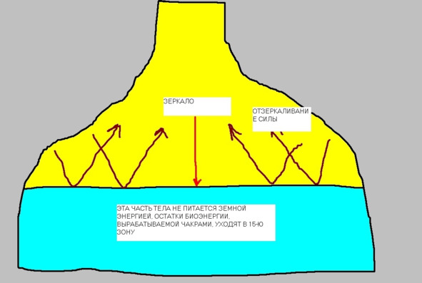 Когда-то в одной из своих прошлых жизней душа твоя не смогла отработать качество 15-й зоны. Поэтому приходится возвращаться к этому сейчас. Целитель Света увидел внутри твоего тела «зеркало», которое на самом деле должно находиться в области ступней. У тебя же оно расположено в груди. Поэтому ½, а точнее, низ твоего тела, как бы находится в Зазеркалье, то есть он питает энергией Зазеркалье, а не твои чакры, не твоё биополе и не твою судьбу.