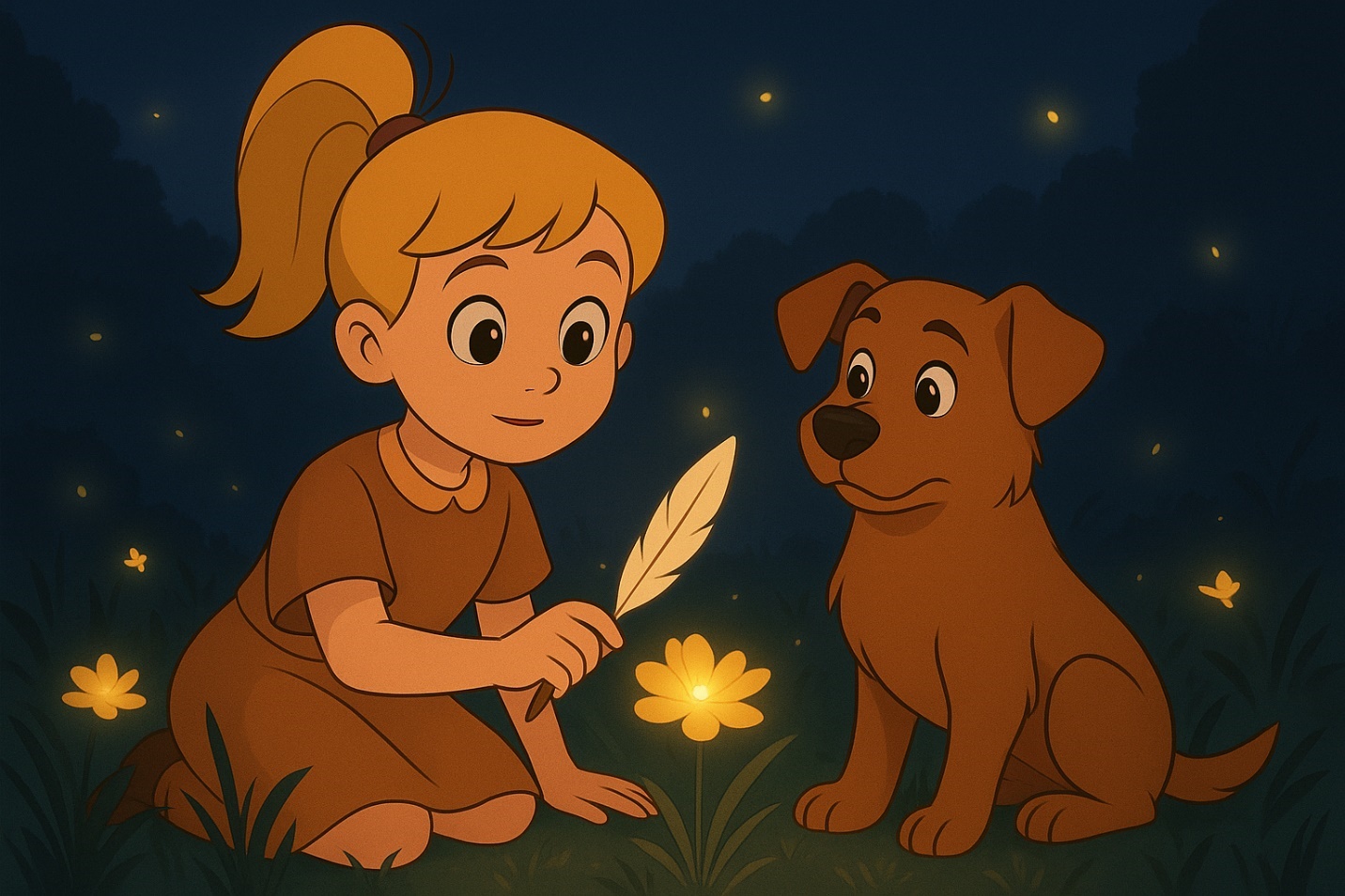Перо дрогнуло, словно отвечая, и буквы исчезли. И тут впереди послышался шорох. Из густой травы показался необычный зверёк: маленький, пушистый, с огромными ушами и глазами, в которых отражалось небо. Он подошёл ближе и пискнул, словно зовя нас за собой.