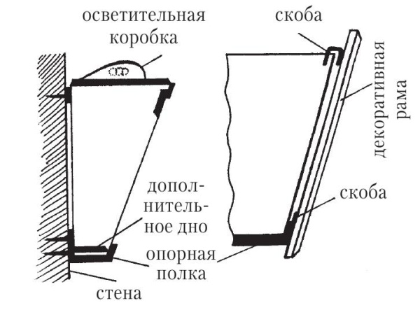 Аквариум крепят на скобах или ставят на специальную полку, а сверху крепят декоративную раму. Для удобства обслуживания она должна быть съемной. Сверху над аквариумом устанавливают осветительную коробку, где уместны U-образные лампы дневного света ЛБ-30 и ЛАУ-30. Рефлектор коробки должен отражать лучи вниз и назад, не мешая наблюдателю. Прекрасно смотрятся в небольшой «картине» светящиеся эритрозонусы, пульхеры, неоны и другие харациновые. Крупные рыбы не подходят для содержания в навесной «картине» – им просто негде развернуться.