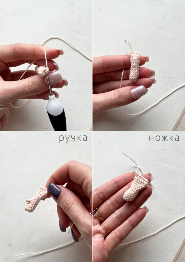 11. -12. 13 сбн (2 ряда) Ножка готова. Можно чуть-чуть набить внизу. Последняя петелька сбоку ножки. Сложить края детальки вместе и провязать 6 сбн. Ниточку закрепить, обрезать и спрятать.