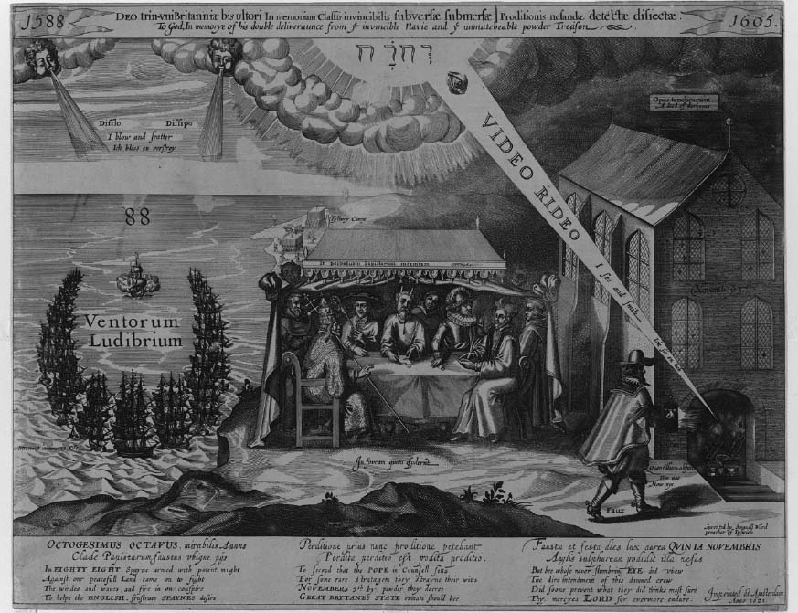‘The Double Deliverance’: Samuel Ward’s print, published in Amsterdam in 1621 and widely distributed. In the centre the Pope and a Spanish grandee (King Philip II?), with advisers including the Devil, plot England’s destruction. Left: the Armada of 1588 is blown away by the wind from Heaven. Right: Guy Fawkes prepares his deadly plot but the all-seeing Jehovah smiles on his chosen people in England. [16]