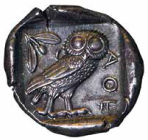 Owls depicted as cultural icons in a Punch cartoon from 1888, an Ancient Greek coin, and a clay plaque from Iraq, c. 1792–1750 BCE.