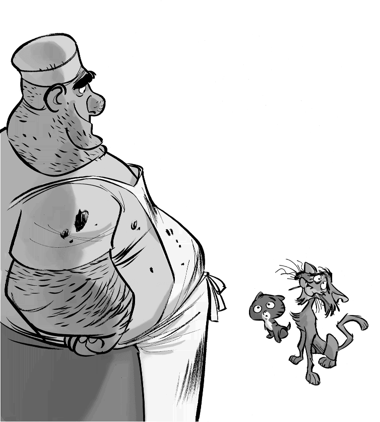 Итак, пока повар был занят завтраком, Додо и Помпончик промчались по коридору, что вёл в кухонные помещения. Коты пролезли через входную решётку, взобрались по лестнице и нырнули в дверь, прошмыгнув между начищенными до блеска сапогами надзирателей.