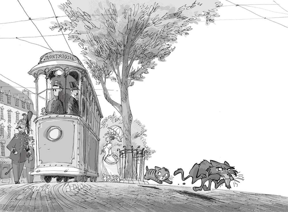 Мимо с треньканьем проезжал трамвай. Марсельезыч и Помпончик шустро спрыгнули на его крышу. Пока трамвай ехал на Монмартр, коты смогли спокойно отдохнуть. На этот раз в животе у Додо не урчало, а кричало и рычало! Бродяга так переволновался, что забыл вернуться к повару Паншону за объедками.