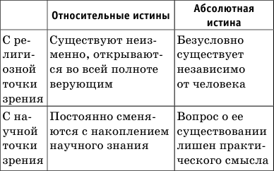 Истина может быть абсолютной (знание во всей его полноте, недоступное человеку) и относительной (знание, соответствующее текущему уровню науки).