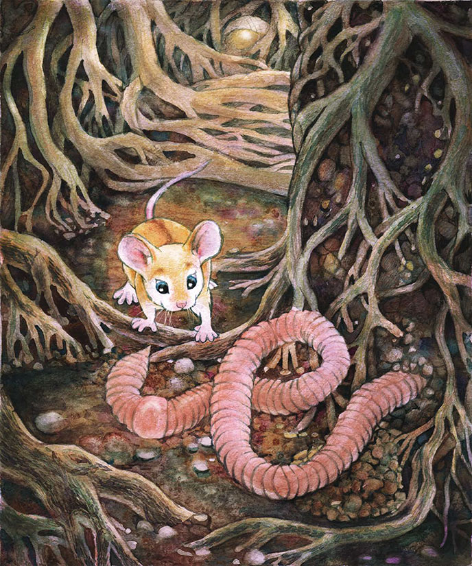 Однажды, возвращаясь к Маме, Мышонок увидел, что земля прямо в его норке непонятно шевелится. Мышонок остановился и стал наблюдать за несколькими комьями земли, которые словно бы ожили и медленно двигались. Наконец они упали на пол норки, и из стены появилось что-то странное, красное и длинное, похожее на чей-то извивающийся язык.