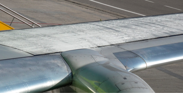 Крыло самолёта ожидаемо покрыто слоем топливного обледенения. Пока летели на эшелоне, температура керосина опустилась значительно ниже нуля. Несмотря на то, что мы полетали некоторое (даже излишнее!) время в относительно тёплом итальянском небе, отогреться керосин не успел. Поверхность крыла благодаря находящемуся внутри топливу остыла, на ней осела влажность, которой в воздухе Вероны было предостаточно. А так как крыло очень холодное, то влага мигом замерзла. Значит перед вылетом будем обливаться – обрабатывать самолёт специальной жидкостью, удалять накопившийся лёд.