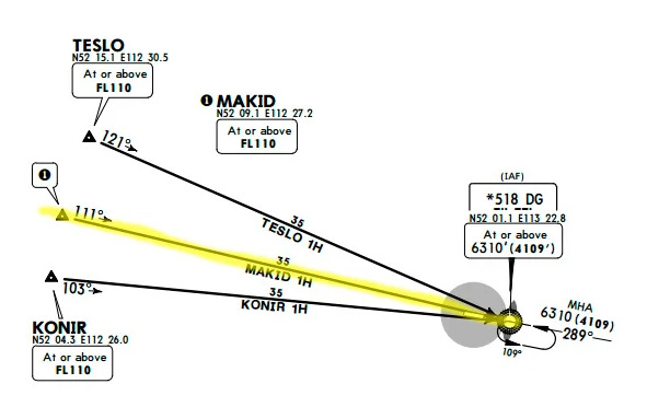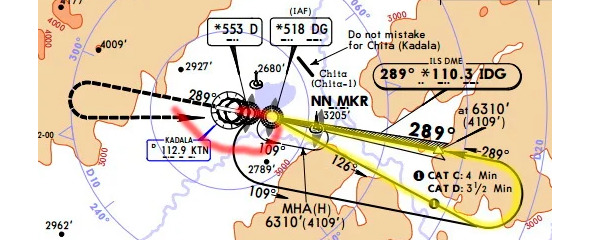 В Чите пилот Боинг-737 авиакомпании S7 Airlines, выполняющий рейс из Москвы, обычно летит по «дороге», отмеченной жёлтым маркером на рисунках. Сначала он с курсом 111° выходит на радиостанцию с позывным DG. Далее три с половиной минуты летит с курсом 126°, прилично углубляется в горы, затем выполняет левый разворот на посадочный курс 289°. Захватывает луч курсового маяка ИЛС и, следуя на высоте 1250 метров, долетает до точки начала снижения, находящейся примерно в тринадцати километрах от торца полосы.