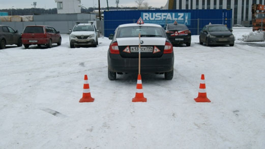 Ставим конусы сзади автомобиля на расстоянии 3 м от автомобиля, в линию, один по центру, два остальных по краям, чтобы их было видно в боковые зеркала заднего вида, вставляем в них вешки.