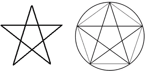 Отсюда получали и классическую пентаграмму. Для этого нужно вынести человека из центра образованного круга вверх и соединить образовавшиеся пять точек линиями. Пентаграмма играет очень важное значение в магии. Примеры пентаграмм приведены на следующих рисунках.
