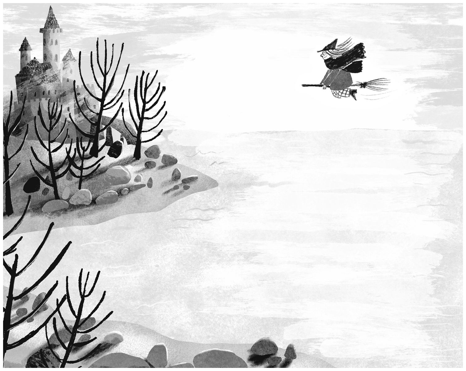 С этими словами она наклонила метлу вниз и устремилась к низкому холму у кристально чистого озера.