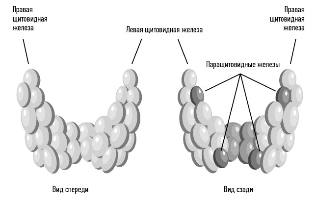 У нашей героини есть соседки – паращитовидные железы. Почему мы говорим о них во множественном числе? А потому что их в среднем четыре штуки. Они находятся на ткани щитовидной железы, только сзади. Отсюда и название – пара- (то есть около-) щитовидные (рис. 2).