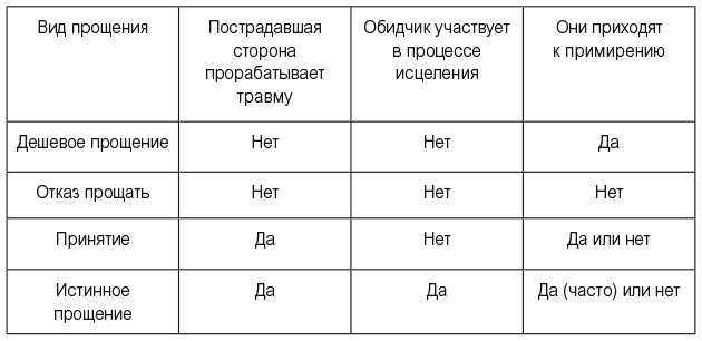 Четыре подхода к прощению: сравнениеВ приведенной таблице показана разница между четырьмя подходами к прощению.